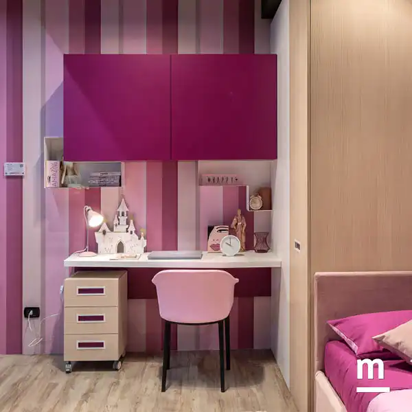 Un’aggiunta perfetta per ogni cameretta è la cabina armadio Long Square, che si inserisce armoniosamente nell’ambiente, ottimizzando lo spazio disponibile. Per un angolo studio pratico e vivace, la scrivania sospesa con un robusto piano da 40 mm rappresenta la scelta ideale, coniugando estetica e solidità.