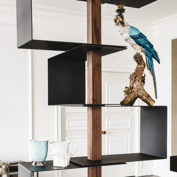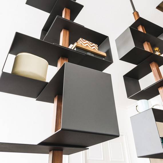 Tokyo della Cattelan Italia è una libreria moderna a soffitto con struttura e ripiani in acciaio verniciato goffrato bianco, nero o graphite e inserti in noce Canaletto. Portata massima per ripiano 4 Kg.