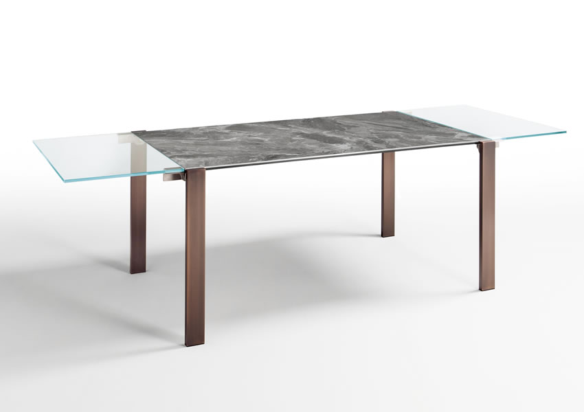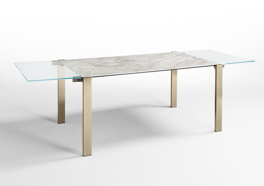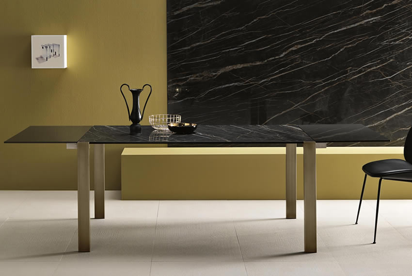 Tavolo moderno Livingstone Ceramic, di Tonelli Design, disponibile con piano allungabile in ceramica+vetro in 3 diverse finiture lucide effetto marmo: Noir Desir, Calacatta Arabescato, Grigio Orobico.