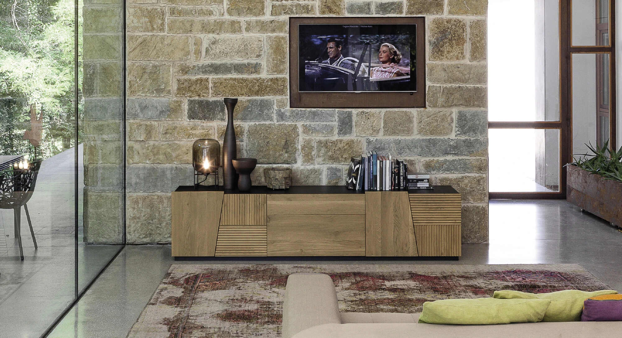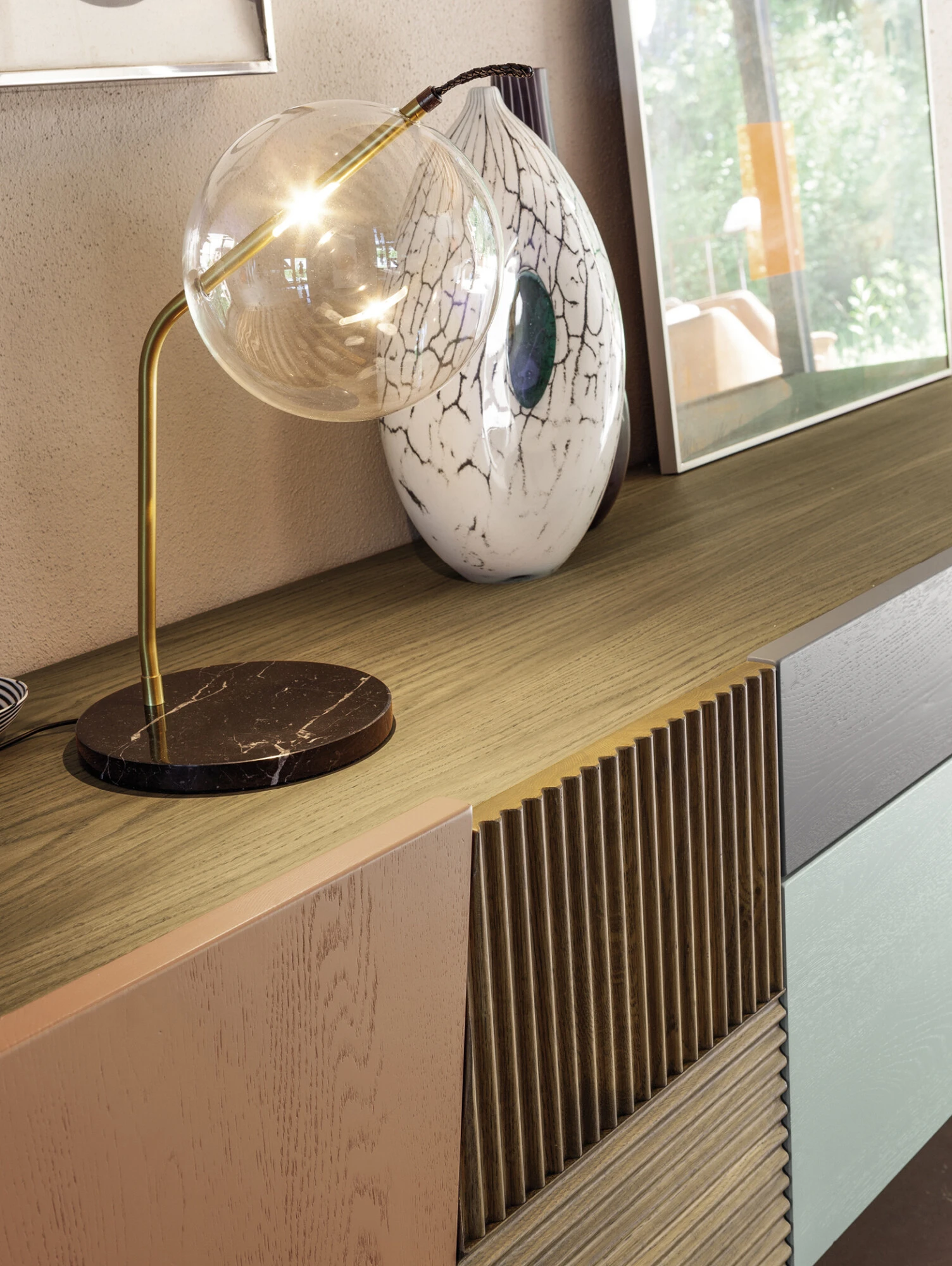 Le madie Zero.16 e Zero.22, con i loro tratti asimmetrici, i colori tono su tono e i dettagli in vetro e alluminio, definiscono un linguaggio originale e universale. La versione porta TV con zoccolo a terra e l’agile contenitore a sei cassetti si adattano a diversi ambienti, dal living alla camera da letto.