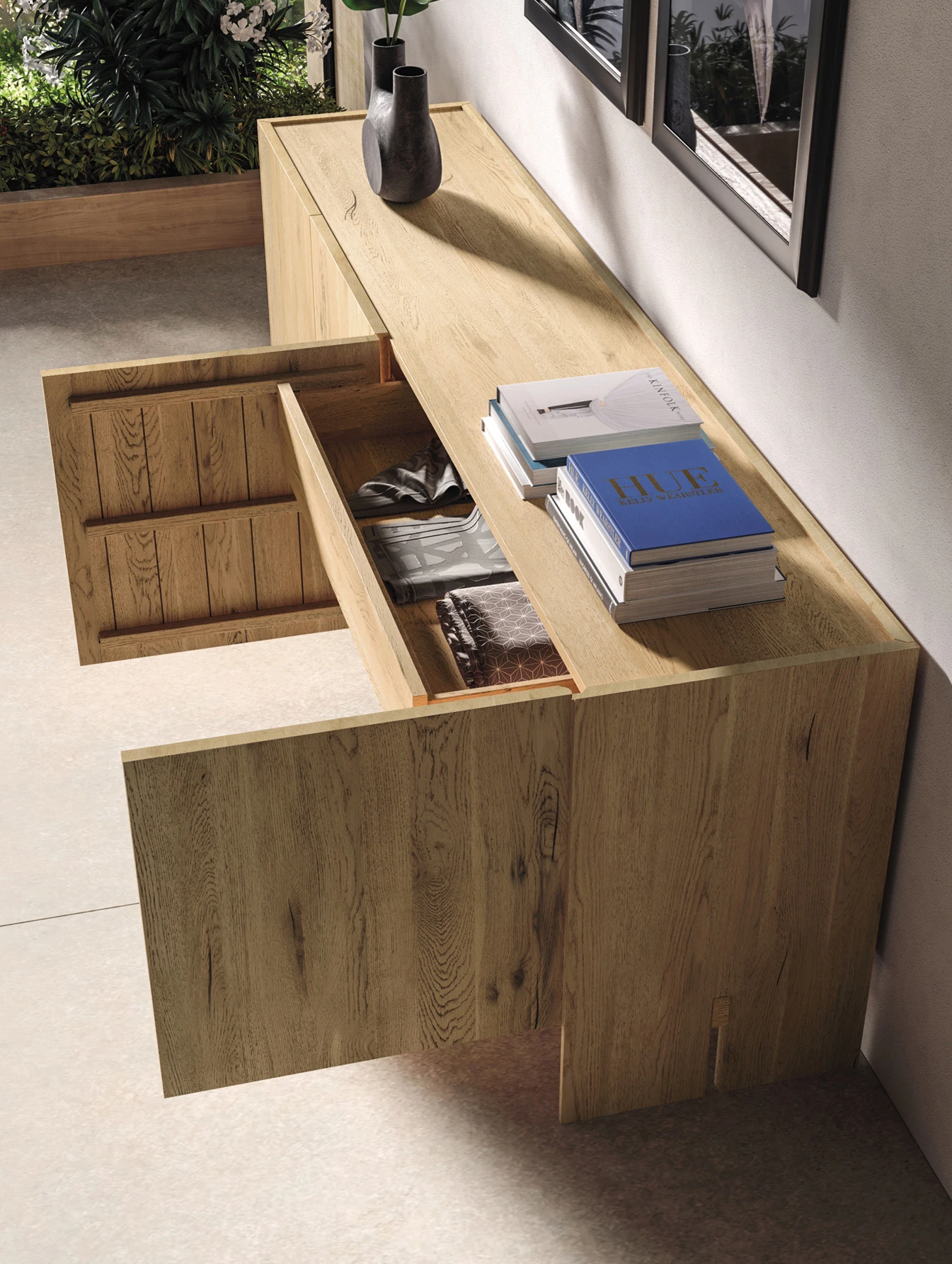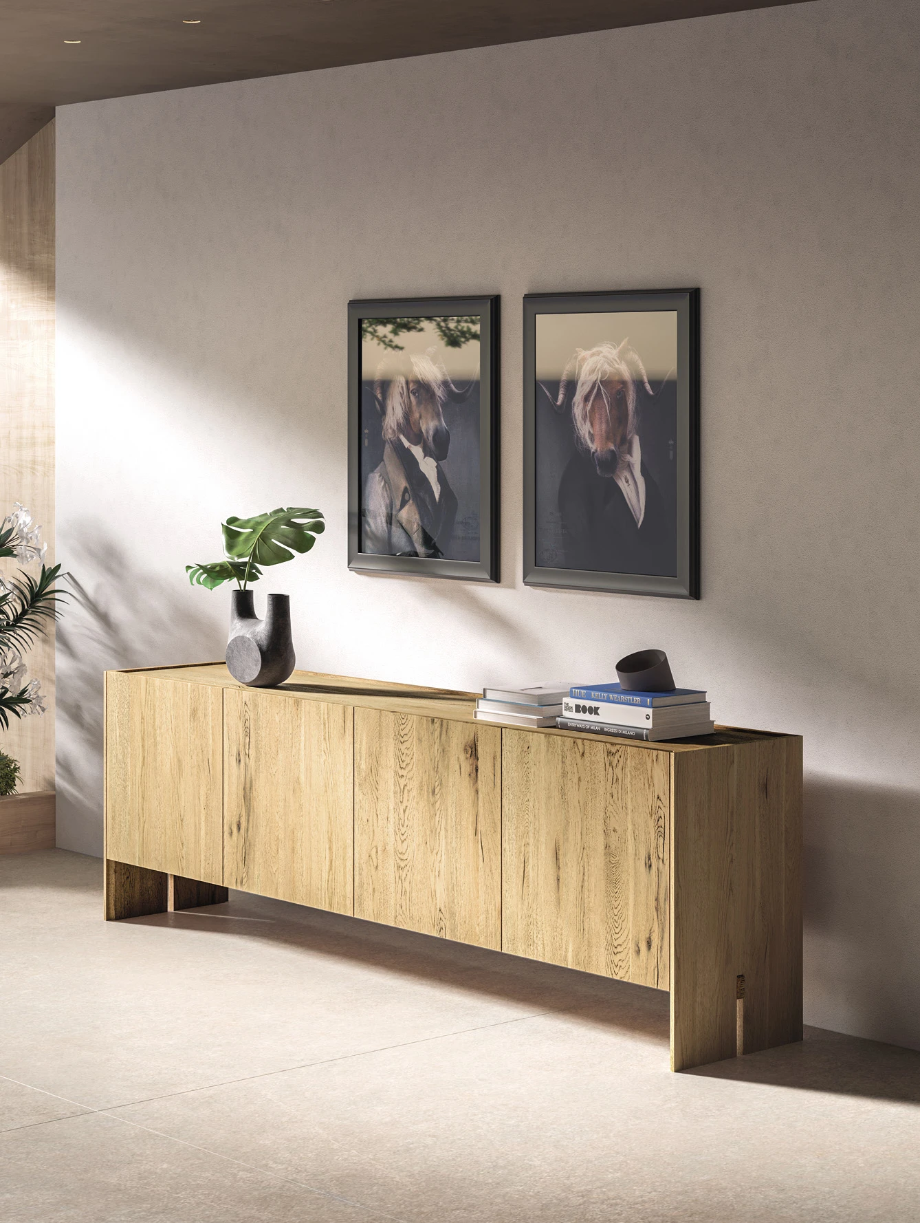 La madia Arbor di Devina Nais combina l’autenticità del legno con un design sofisticato e moderno. Le venature naturali del legno, interrotte dal vano a giorno, creano un effetto decorativo unico. Le gambe lineari e il traverso orizzontale aggiungono leggerezza e contemporaneità.