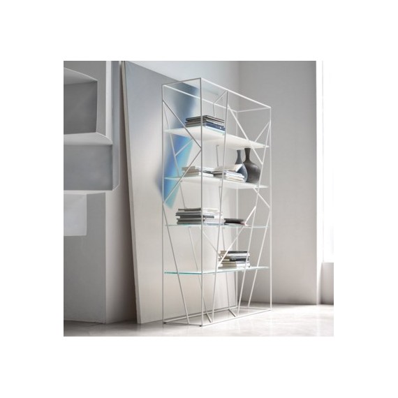 Libreria in fili di metallo laccato con ripiani in vetro temperato.
