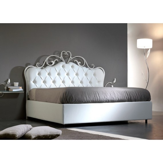 Letto in ferro battuto con testata imbottita liscia o con motivo capitonné. A richiesta con tre o 24 Swarovski. Per rete da cm. 160 x 190, dimensioni esterne cm. 173 x 207, altezza testata cm. 135.
