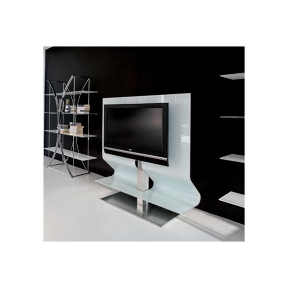 Porta tv orientabile in vetro curvo, con supporto in acciaio inox satinato. L’estrema difficoltà di curvatura del vetro che caratterizza questo oggetto lo rende unico nonché un prodotto storico di Tonin Casa.