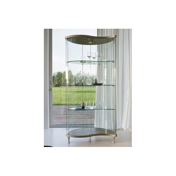 Vetrina in legno con ante e schienale in vetro curvato. Disponibile in diverse finiture e con faretto. Una forma scultorea per una vetrina che arreda ogni spazio all’insegna del design.