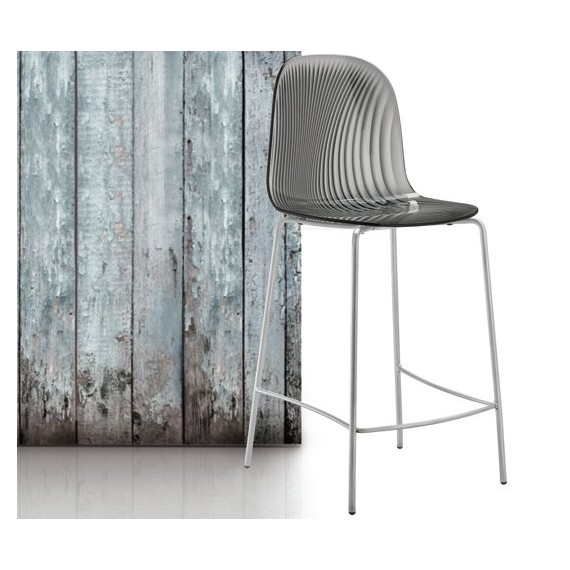 Sgabello con base in acciaio verniciato, scocca in stirene acrilo nitrile.