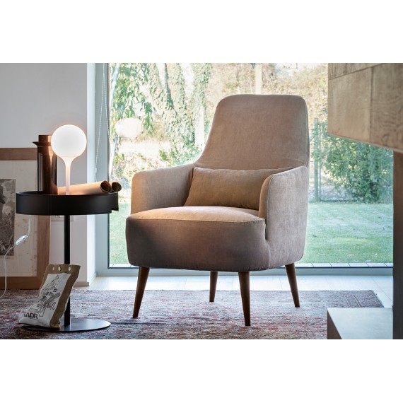 Poltrona dalle linee avvolgenti e confortevoli, sostenuta da eleganti piedi in legno che le donano un’aria sofisticata, in perfetto equilibrio fra sapore vintage e design moderno.