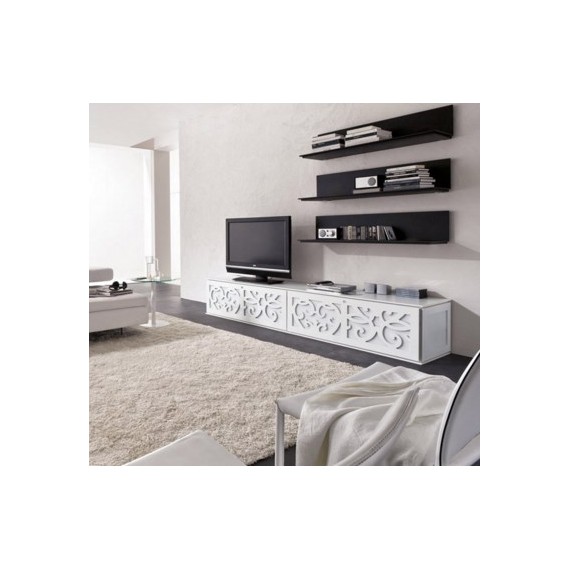 Porta TV in legno; cassettoni con frontali traforati; vetro temperato.