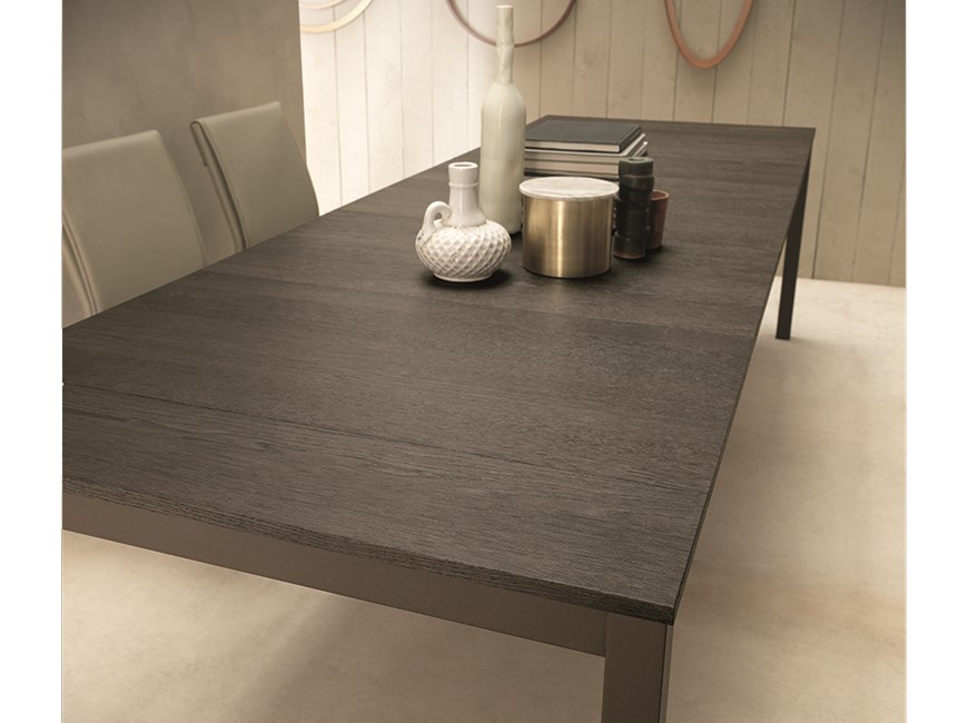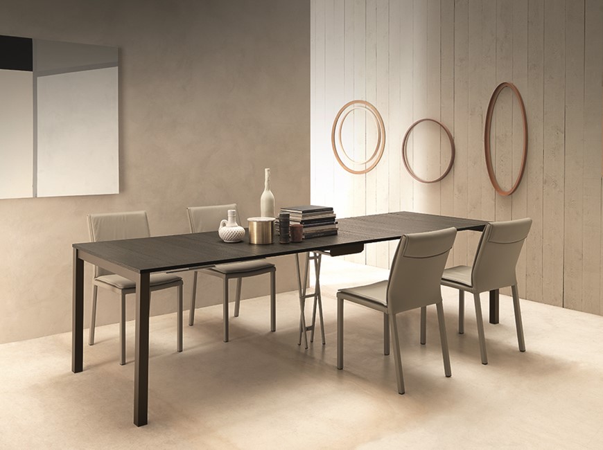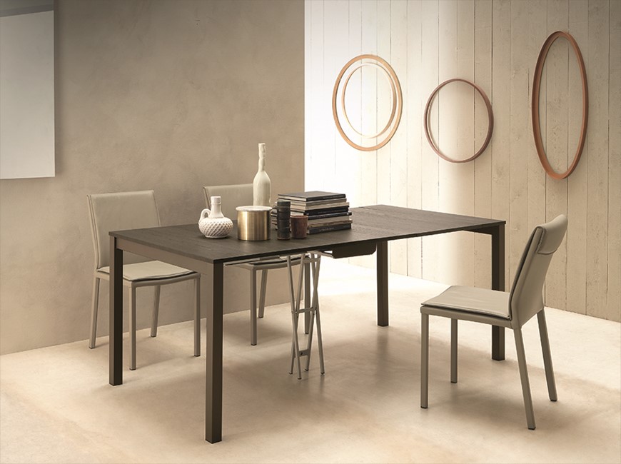 E’ realizzata con struttura in metallo, meccanismo telescopico in alluminio, piano in nobilitato, laccato, legno o effetto malta, 3 o 5 allunghe.