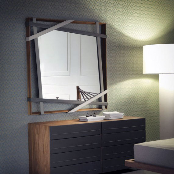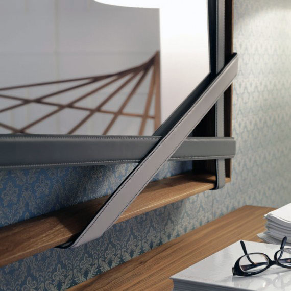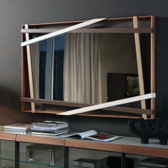 Design: Andrea Lucatello. Rebus della Cattelan Italia è uno specchio moderno da parete con cornicie in noce Canaletto e inserti in cuoio.