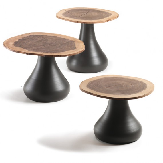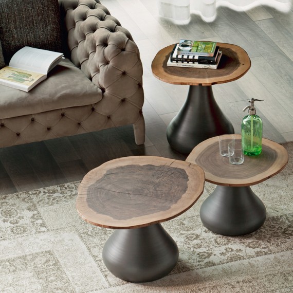 Rio della Cattelan Italia è un tavolino da salotto con base in alluminio verniciato goffrato bianco o graphite. Piano in MDF impiallacciato con sezione di tronco d’albero di noce. Misure del piano indicative, ogni pezzo è unico e diverso nella forma e nella misura.