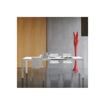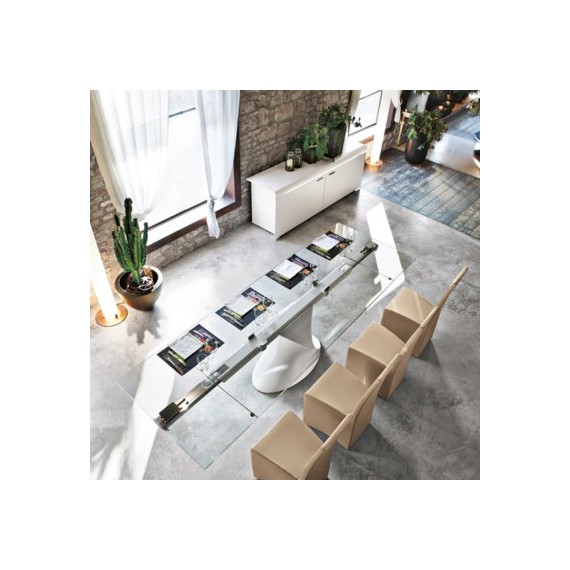 Tavolo allungabile con binario centrale interamente in alluminio, piano e allunghe in vetro temperato. Basamento in agglomerato dalle forme scultoree ideale per chi cerca un design raffinato e senza tempo.