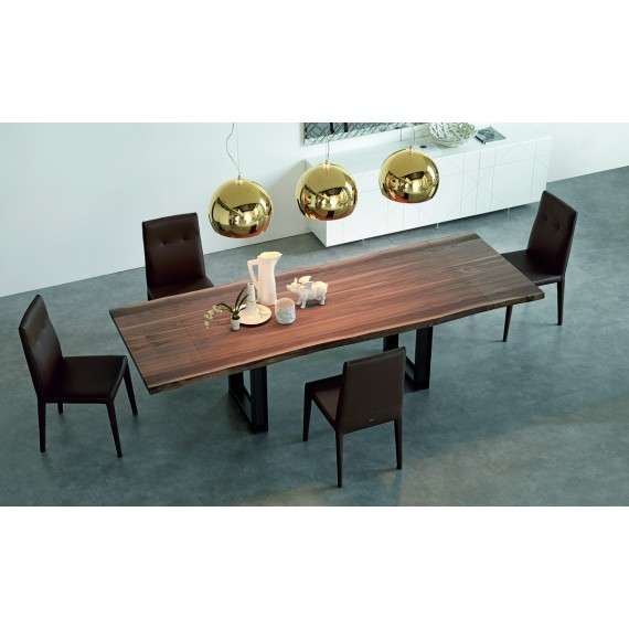 Sigma Drive è un tavolo allungabile della Cattelan Italia con base in metallo verniciato trasparente. Piano e prolunghe in noce Canaletto, rovere bruciato o rovere naturale con bordi irregolari in massello.