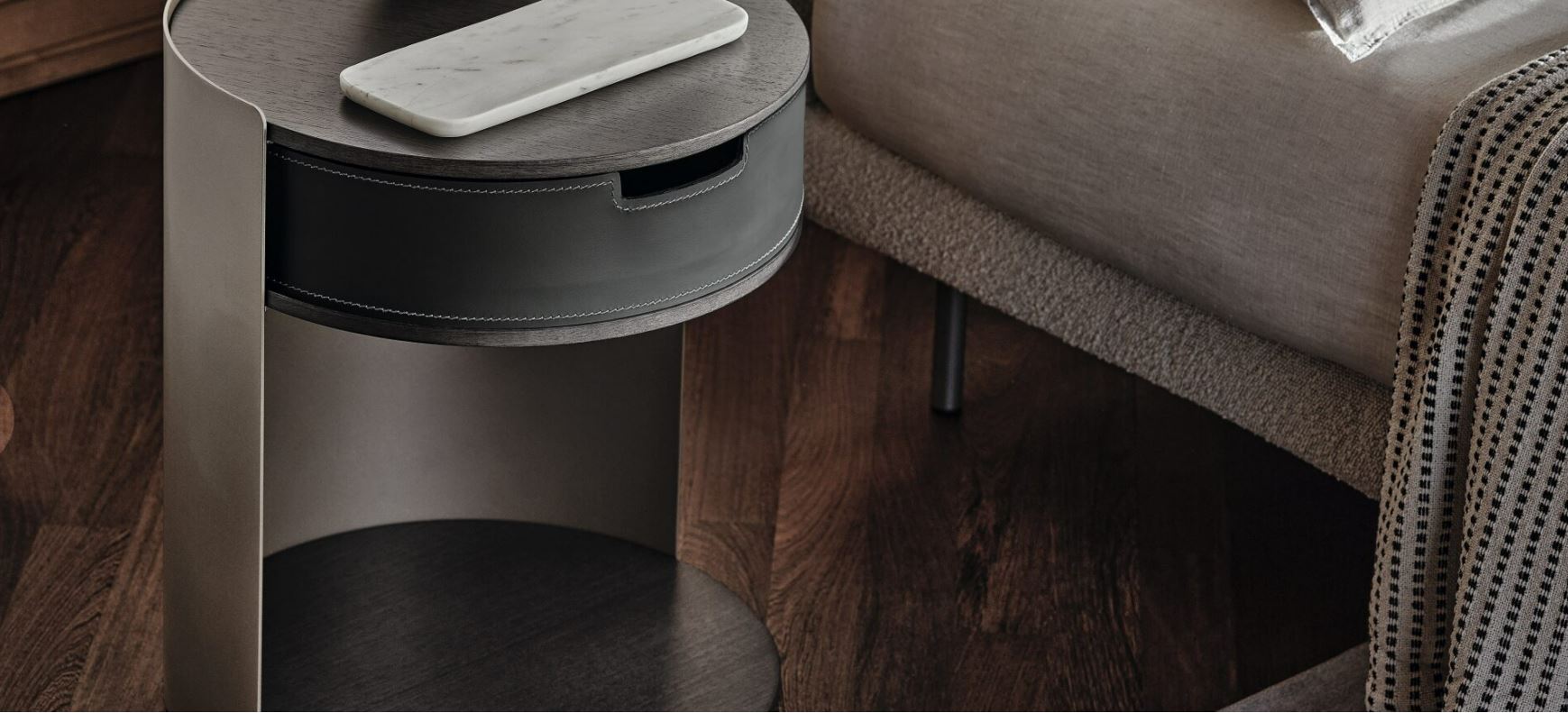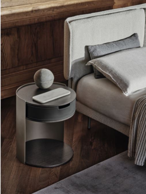 Modello disegnato da Daniele Lo Scalzo Moschieri, cattura da subito l’attenzione per la particolare forma rotondeggiante, si sviluppa su due livelli , la base lasciata aperta mentre il primo diventa un cassetto capiente grazie la chiusura molto particolare in pelle con cuciture a vista. Un design accattivante per chi ha un gusto deciso e vuole aggiungere un complemento d’arredo particolare alla propria stanza da letto.