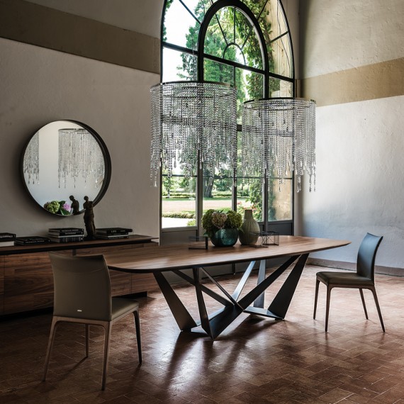 Skorpio Wood della Cattelan Italia è un tavolo fisso con base in acciaio verniciato trasparente, arancio fluo, goffrato bianco, nero o graphite.