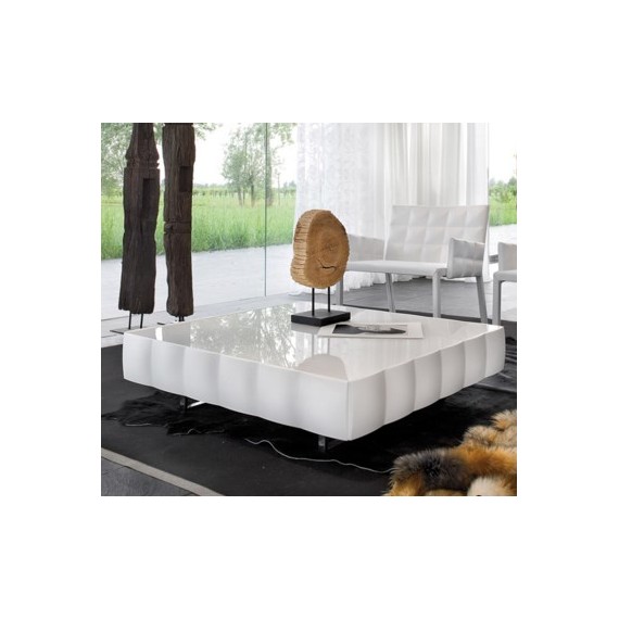 Tavolino quadrato con cassetto in legno capitonné laccato; top in vetro temperato; basi in metallo cromato.