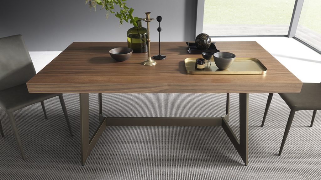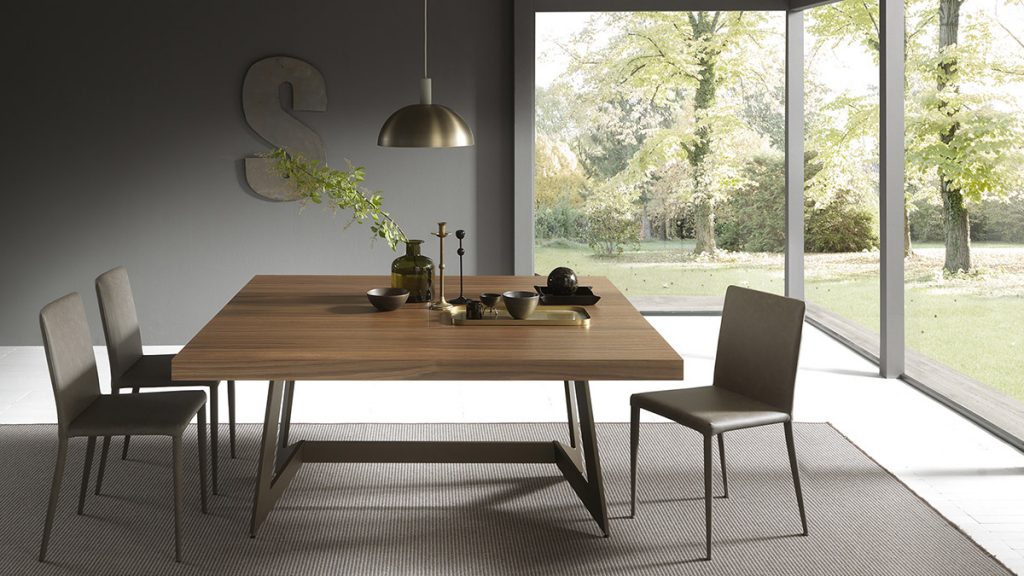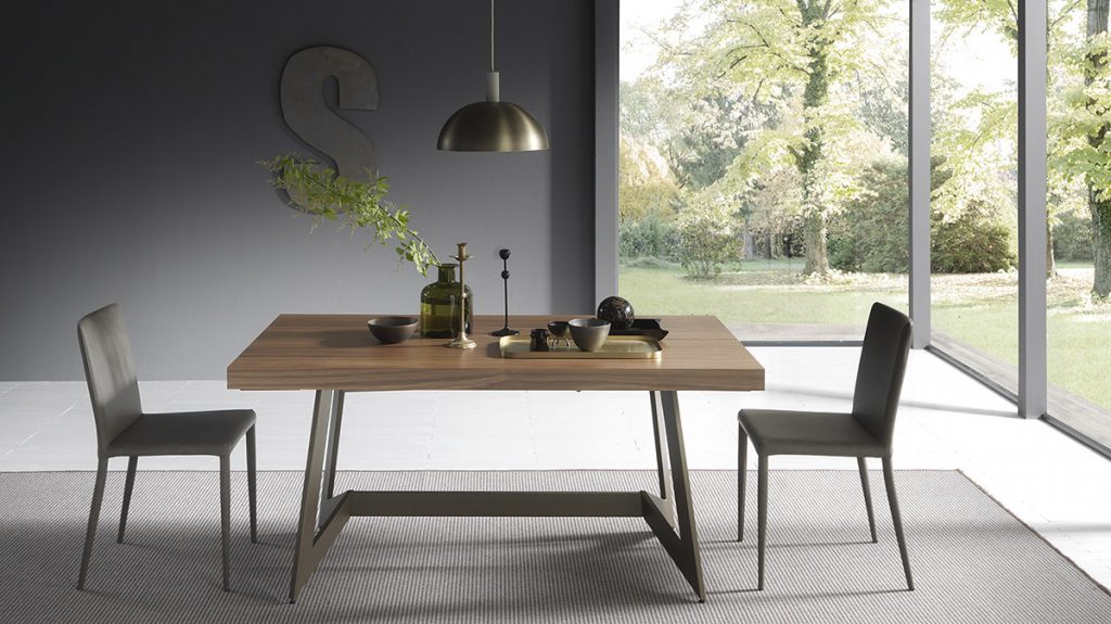 Sipario, della Altacom Italia, è un tavolo da pranzo allungabile con struttura in metallo e piano in nobilitato, legno o effetto malta.