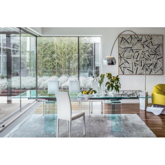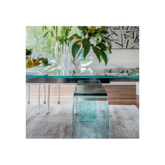 Tavolo fisso o allungabile con binario in alluminio e piano in vetro temperato. Basamento realizzato in vetro curvo. Design intramontabile da adattare a tutte le situazioni domestiche.