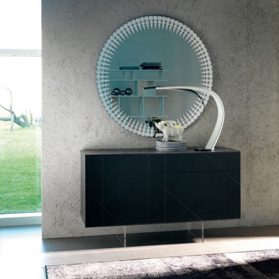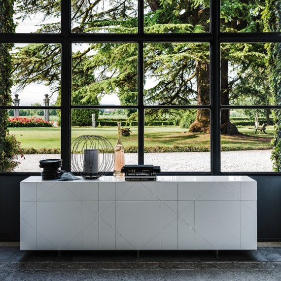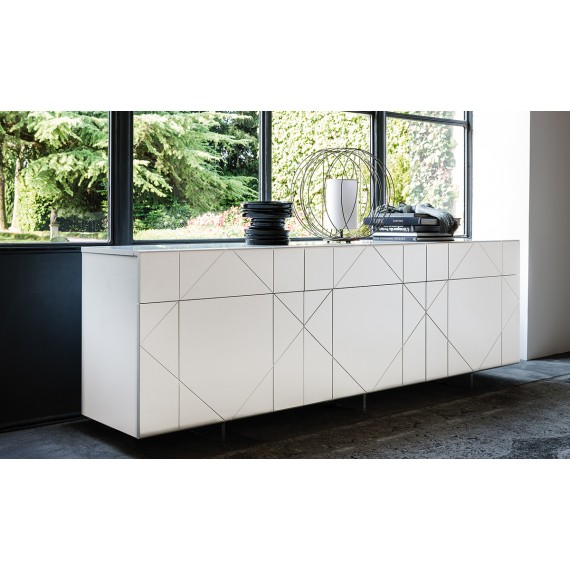 Tropez della Cattelan Italia è una madia contenitore moderna con ante e cassetti laccata bianco o graphite opaco. Piedi in metacrilato trasparente.
