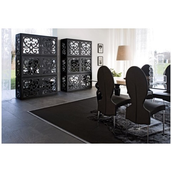 Un programma di contenitori realizzato in MDF microgoffrato con antine laserate con vetro temperato e maniglie in Swarovski®.