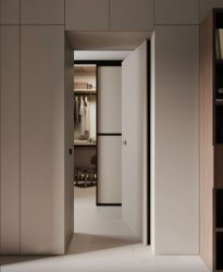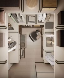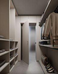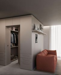 Si ricava un quadrato anche di circa 5/10 mq dell’appartamento in cui già nella parete esterna sono presenti ante e cassetti, utili a riporre gli indumenti per l’esterno (cappotti, sciarpe, cappelli, guanti) mentre all’interno invece crea delle vere e proprie soluzioni salva-spazio, sviluppando in tutta la lunghezza la cabina armadio, con elementi chiusi (cassetti, scaffali ad ante) ed elementi aperti (nicchie e scaffali aperti dove riporre per lo più le scarpe o le borse).