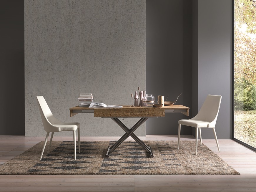 La prerogativa del tavolo multiuso Compact di Altacom, e’ quella di adattarsi alle diverse esigenze che possono presentarsi nella zona living. Grazie a meccanismi brevettati e prodotti in azienda, il tavolo Compact puo’ trasformarsi da tavolo da salotto a tavolo da pranzo grazie al meccanismo a gas ed alle funzionali prolunghe. Prodotto con base in metaaloe piano in nobilitato, legno,o effetto malta.